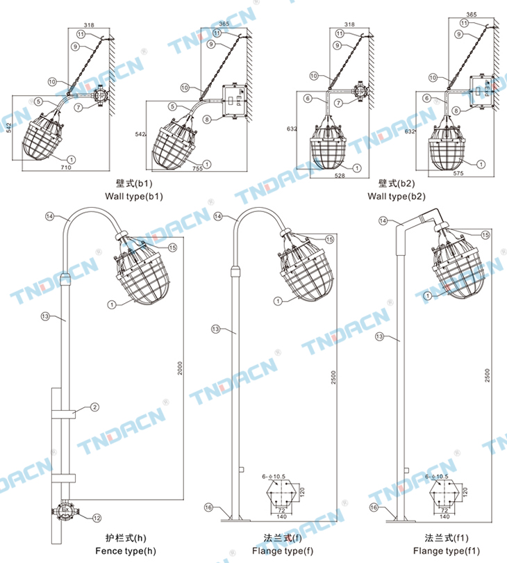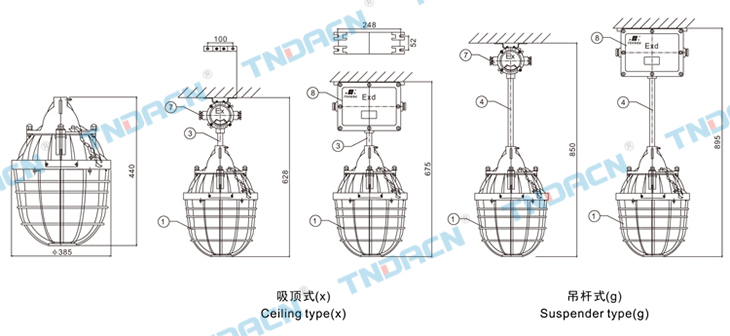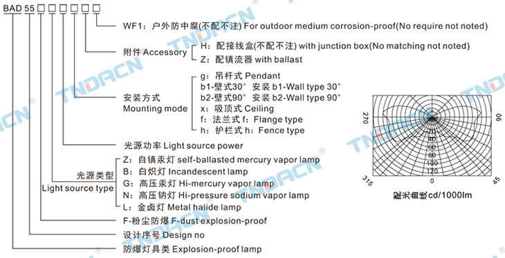 1.1區(qū)、2區(qū)危險(xiǎn)場所或20區(qū)、21區(qū)、22區(qū)危險(xiǎn)場所; 2.ⅡA、ⅡB、ⅡC爆炸性氣體環(huán)境或可燃性粉塵環(huán)境; 3.戶內(nèi)、戶外(IP54、IP65*); 4.溫度組別:T1~T4/T5/T6; 5.可配裝白熾燈、汞燈、高壓鈉燈、金鹵燈; 6.應(yīng)用于石油、化工、航天、軍工等場所。 1.Hazardous:division 1 &2,or 20,21,&22; 2.Explosive gas atmosphers: classⅡA ⅡB ⅡC orinflammable dust environment; 3.Indoor or outdoor(IP54,IP65*); 4.Temperature class:T1~T4/T5/T6; 5.Equipped with incandescent lamp, mercury vapor lamp,high-pressure sodium vapor lamp, metal halide lamp. 6.Widely using in the fields of oil ,Chemical industry, spaceflight,war ind-ustry and so on.
