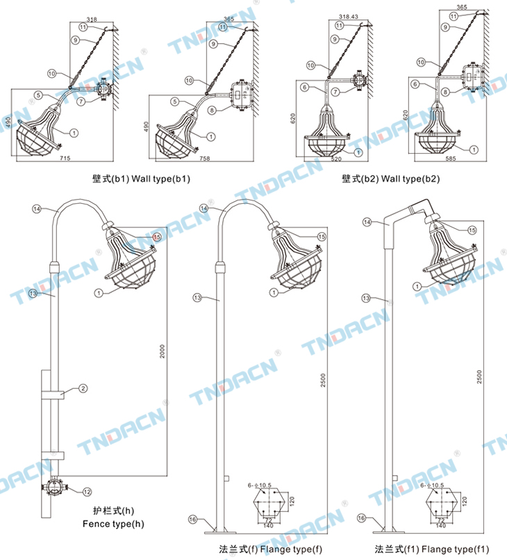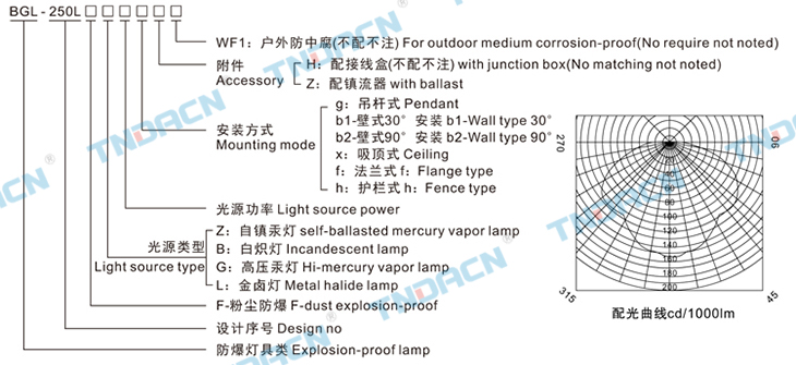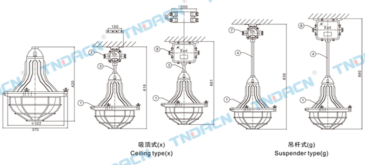 1.殼體采用高強(qiáng)度合金鋁一次性壓鑄成型,表面經(jīng)高速拋丸清理后高壓靜電噴塑。外殼結(jié)構(gòu)緊湊合理、材質(zhì)密度高強(qiáng)度好、防爆性能優(yōu)良,表面塑粉附著力強(qiáng)具有良好的防腐能力,表面光潔,美觀大方; 2.燈罩采用高硼硅鋼化玻璃,透光率高,可承受高強(qiáng)沖擊; 3.采用密封結(jié)構(gòu),保證了較強(qiáng)的防水、防塵能力; 4.采用活節(jié)螺栓緊固,能快速向上開(kāi)啟,便于維修; 5.鋼管布線。 1.The enclosure is moulded by the high strength aluminum alloy for one time. With fine flameproof functions. Its exteriorhas sprayed with plastic by high pressure static atfer shot blasting at high speed. It has strong adhesion of pasticpowder and great anti-corrosive performance. 2.Lamp housing is made of high borosilieate toughened glass with high transmittance, and it can withstand strong impct. 3.It has sealing structure, which has ensured the great functions of water proof and dust proof. 4.Suspension type thumb nut is used for fastening so that it can be quickly opened up upwards and is convenient formaintenance. 5.Conduit wiring.