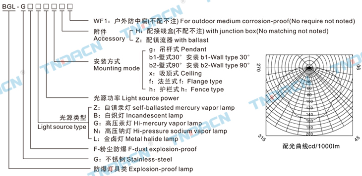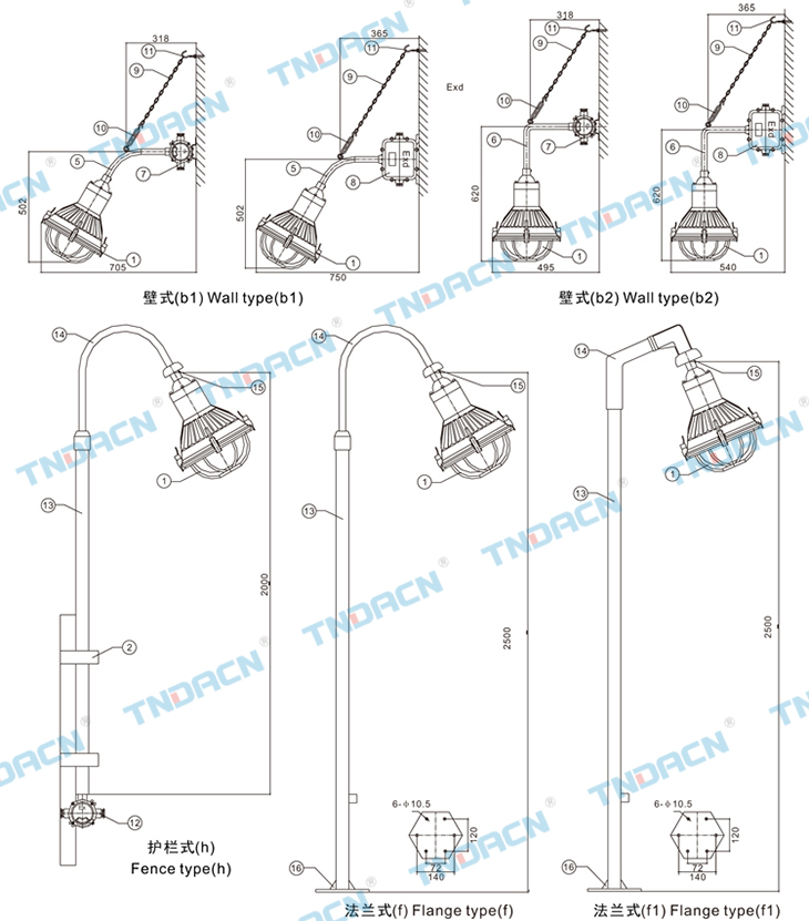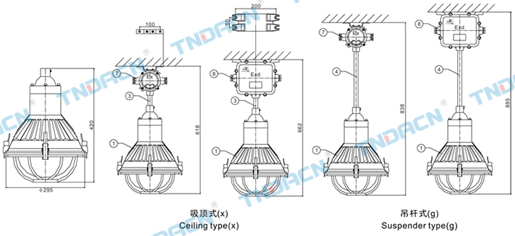 1.1區(qū)、2區(qū)危險場所或20區(qū)、21區(qū)、22區(qū)危險場所; 2.ⅡA、ⅡB、ⅡC爆炸性氣體環(huán)境或可燃性粉塵環(huán)境; 3.戶內(nèi)、戶外(IP54、IP65*); 4.溫度組別:T1~T4/T5/T6; 5.可配裝白熾燈、汞燈、高壓鈉燈、金鹵燈; 6.注:當(dāng)用作增安型時,不配鈉燈; 7.應(yīng)用于石油、化工、航天、軍工等場所。 1.Hazardous:division 1 &2,or 20,21,&22; 2.Explosive gas atmosphers: classⅡA ⅡB ⅡC orinflammable dust environment; 3.Indoor or outdoor(IP54,IP65*); 4.Temperature class:T1~T4/T5/T6; 5.Equipped with incandescent lamp, mercury vapor lamp,high-pressure sodium vapor lamp, metal halide lamp. 6.Note:When the time for increased safety, deserve sodium. 7.Widely using in the fields of oil ,Chemical industry, spaceflight,war ind-ustry and so on.