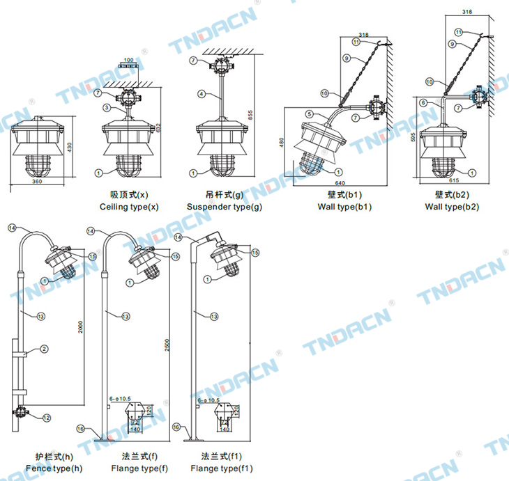 1.殼體采用高強(qiáng)度合金鋁一次性壓鑄成型,表面經(jīng)高速拋丸清理后高壓靜電噴塑。外殼結(jié)構(gòu)緊湊合理、材質(zhì)密度高強(qiáng)度好、 防爆性能優(yōu)良,表面塑粉附著力強(qiáng)具有良好的防腐能力,表面光潔,美觀大方; 2.燈罩材質(zhì)采用高硼硅玻璃,透光性好,且具有防眩光設(shè)計(jì); 3.具有良好的防塵,防爆性能。 4.鎮(zhèn)流器、觸發(fā)器均安裝于燈體內(nèi),安裝簡單方便。 5.內(nèi)裝元件用澆封結(jié)構(gòu),性能穩(wěn)定且防爆性能較高。 6.鋼管布線。 1.Shell made of high strength aluminum alloy casting off the surface after blast cleaning by high voltage electrostatic spray. Shell compact structure, high density material strength, Explosion-proof performance, the surface of plastic powder adhesion ability with good anti-corrosion, the surface smooth, elegant appearance; 2.Lamp housing is made of high borosilicate glass with great transmittance and high energy shock resistance. It's the antiglare design. 3.Possessing good properties for dustproofing and corrosion-proofing. 4.The ballast and trigger are all mounted inside the lampbody so that it's easy for installation. 5.The inner elements abopt casting structure with stable property and high strength for corrosion-proof. 6.Conduit wiring.