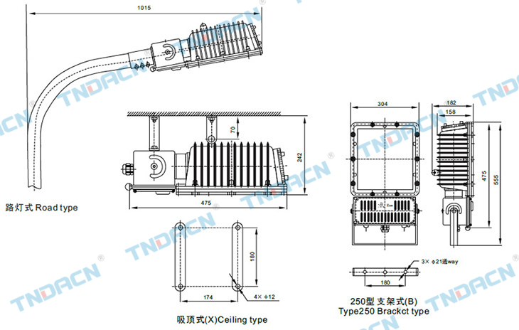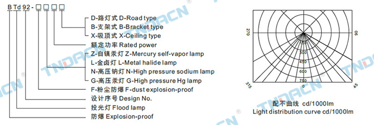 1.殼體采用高強度合金鋁一次性壓鑄成型,表面經(jīng)高速拋丸清理后高壓靜電噴塑。外殼結(jié)構(gòu)緊湊合理、材質(zhì)密度高強度好、 防爆性能優(yōu)良,表面塑粉附著力強具有良好的防腐能力,表面光潔,美觀大方; 2.高硼硅玻璃,透光性好,不銹鋼外露緊固件; 3.燈體可水平安裝或壁式安裝,45~90°可調(diào); 4.燈具與鎮(zhèn)流器等附件為一體式設(shè)計,便安裝維修。有較強的防水性能,可用于石油平臺及油輪艦艇等惡劣環(huán)境場所; 5.反光罩經(jīng)過專業(yè)二次配光設(shè)計,并得到實際應用驗證,采用鏡面不銹鋼反射板,照射角幅度大;可加裝補償電容,補償后CosФ≥0.8; 6.電纜布線。 1.Shell made of high strength aluminum alloy casting off the surface after blast cleaning by high voltage electrostatic spray. Shell compact structure, high density material strength, Explosion-proof performance, the surface of plastic powder adhesion ability with good anti-corrosion, the surface smooth, elegant appearance; 2.Lamp housing is made of high borosilicate glass with great transmittance. Outer fasteners are made of stainless steel. 3.It can have horizontally installation or walled installation. Adjusting in the range of45°~90°. 4.Lamp and ballast are designed holistically to install and maintain conveniently. Using in the petroleum platform, tanker,ships and so on, it has fine water proof function. 5.The reflect should get special software design of distribution for two times, and it can have the confirmation of actual test. The baffle board ismade of mirror finished stainless steel. It makes the light soft and make the irradiation range large. We can also add the compensation capacitor.cosФ≥0.8 6.Wiring with cables.