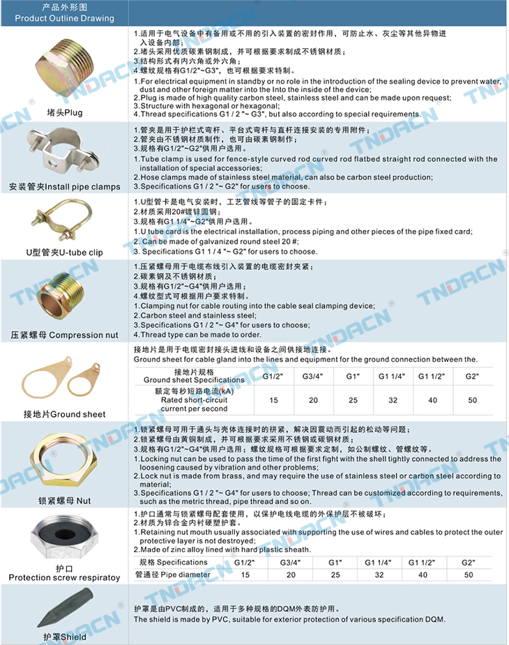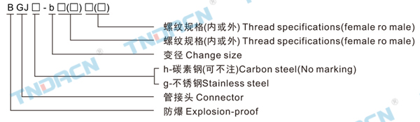 1.本產(chǎn)品采用優(yōu)質(zhì)碳素鋼制成,表面鍍鋅或采用不銹鋼。 2.螺紋規(guī)格可根據(jù)用戶要求制作。 3.防爆標(biāo)志:ExdⅡ等效于 Ⅱ2G ExdⅡ(歐標(biāo)) 1.It's made of carbon steel with good quality, the surface is done with galvanization, or it canbe made of stainless steel; 2.The thread specification can be made on request. 3.Ex-mark:ExdⅡequivalent to Ⅱ2G ExdⅡ(European standard)