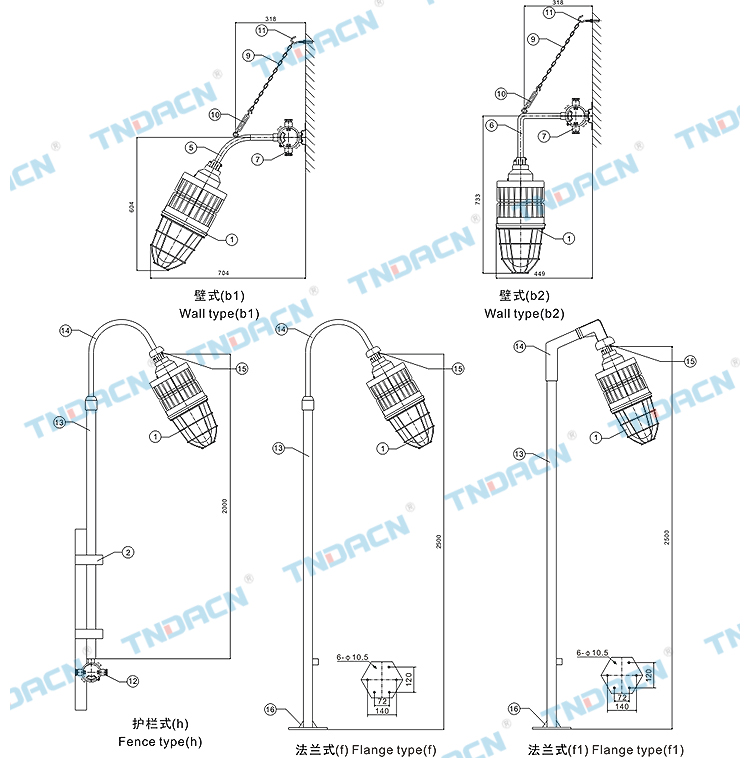 1.20區(qū)、21區(qū)、22區(qū)危險場所; 2.可燃性粉塵環(huán)境; 3.戶內(nèi)、戶外(IP54、IP65*); 4.溫度組別:T1~T4/T5/T6; 5.可配裝白熾燈、汞燈、高壓鈉燈、金鹵燈; 6.應(yīng)用于石油、化工、航天、軍工等場所。 |