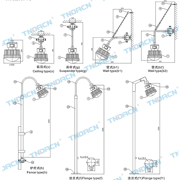 1.20區(qū)、21區(qū)、22區(qū)危險(xiǎn)場(chǎng)所; 2.可燃性粉塵環(huán)境; 3.戶內(nèi)、戶外(IP54、IP65*); 4.溫度組別:T1~T4/T5/T6; 5.可配裝白熾燈、汞燈、高壓鈉燈、金鹵燈; 6.應(yīng)用于石油、化工、航天、軍工等場(chǎng)所。 |