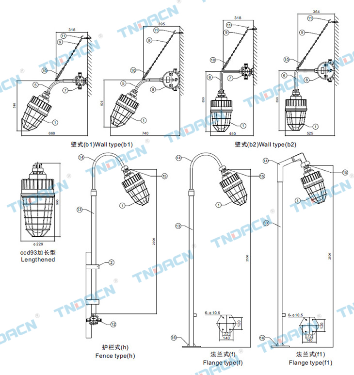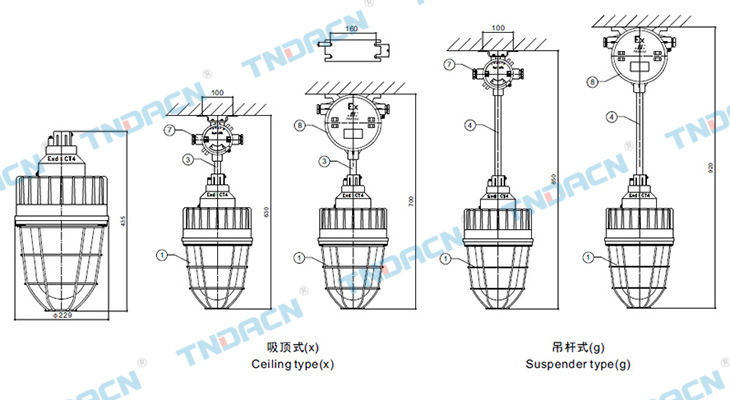 1.殼體采用高強(qiáng)度合金鋁一次性壓鑄成型,表面經(jīng)高速拋丸清理后高壓靜電噴塑。外殼結(jié)構(gòu)緊湊合理、材質(zhì)密度高強(qiáng)度好、 防爆性能優(yōu)良,表面塑粉附著力強(qiáng)具有良好的防腐能力,表面光潔,美觀大方; 2.燈罩采用高硼硅鋼化玻璃,透光率高,可承受高強(qiáng)沖擊; 3.采用密封結(jié)構(gòu),保證了較強(qiáng)的防水、防塵能力; 4.燈體和出線套采用無(wú)線連接,便于用戶安裝和維修; 5.鋼管布線 1.Shell made of high strength aluminum alloy casting off the surface after blast cleaning by high voltage electrostatic spray. Shell compact structure, high density material strength, Explosion-proof performance, the surface of plastic powder adhesion ability with good anti-corrosion, the surface smooth, elegant appearance; 2.Lamp housing is made of high borosilieate toughened glass with high transmittance, and it can withstand strong impct. 3.It has sealing structure, which has ensured the great functions of water proof and dust proof. 4.The lampbody and outlet sleeve use wireless wire connecting, it's convenient for the users to install and maintaince. 5.Conduit wiring.