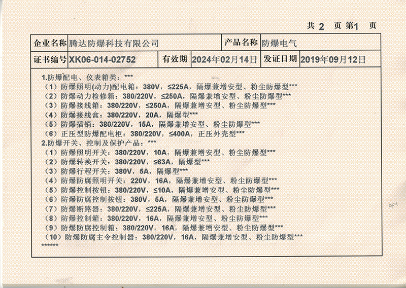 生產(chǎn)許可證 2019-2024年騰達防爆