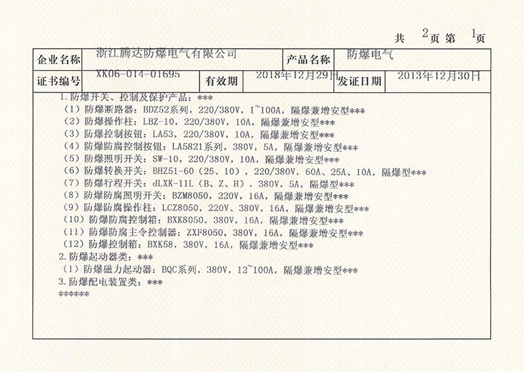 生產(chǎn)許可證 2013-2018年騰達(dá)防爆