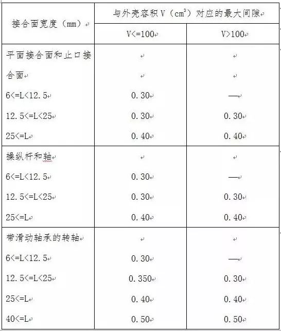 無論是長期關(guān)閉或經(jīng)常打開的外殼,接合面的結(jié)構(gòu)參數(shù)應(yīng)符合GB3836.2-2000Ι類隔爆接合面結(jié)構(gòu)參數(shù)的規(guī)定。其所有隔爆接合面(Ⅰ類)的較大間隙、直徑差或更小有效長度(寬度)必須符合表1的規(guī)定,但快動(dòng)門或蓋的隔爆接合面的更小有效長度須不小于25mm。
